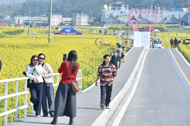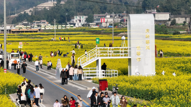 2月14日,阳光洒落在高县庆岭粮油现代农业园区,万亩油菜花海熠熠生辉。彩虹步道上,游客络绎不绝,欢笑声、快门声此起彼伏,人们徜徉于花海之间,尽情感受春日的馈赠。