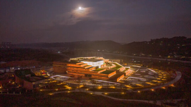 江口沉银博物馆坐落于眉山市彭山区江口街道,紧邻江口沉银遗址,建筑面积3.63万平方米,展陈面积约7800平方米,按国家一级博物馆标准建设。其外墙设计参考了遗址所在河道的红砂岩基岩,肌理层叠起伏,仿佛刚从江水中“生长”而出,与周边的山水浑然一体。
