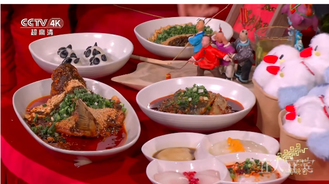 主会场的团圆桌上,宜宾人最熟悉的家乡味一一亮相。桌上摆的,是撒满芽菜、花生碎、葱花的宜宾燃面、清甜爽滑的双河凉糕、麻辣鲜香的椒麻鸡、熊猫汤圆,还有“胖头鱼”“红嘴鸥”等文创摆件。