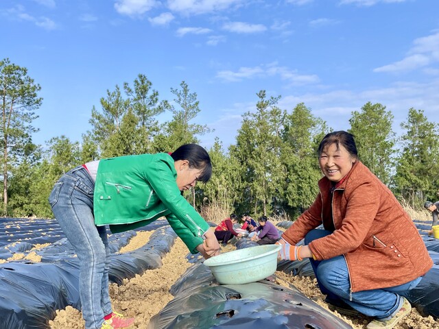 田间地头,工人们分工明确:有的整理根须、有的拿打窝器开孔、有的俯身栽种,动作娴熟利落。丹参栽种有讲究,取地上茎剪成5厘米小段,随剪随插,在畦上按行距20厘米、株距10厘米开浅孔,斜插入土,浇水遮阴,每一步都不含糊。