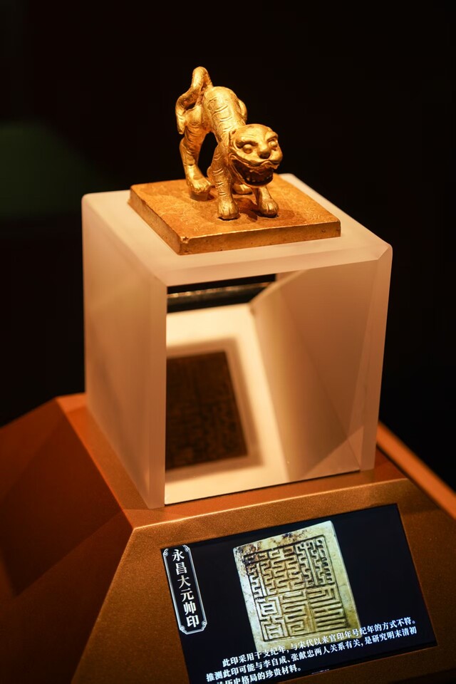 随着参观的深入,历史的叙事也从经济贸易转向了政权更迭。在“大西政权”展区,“永昌大元帅”金印与“西王赏功”金币等核心文物吸引了众多目光。尤其是一组从江口出水的大西政权册封嫔妃金册,铭文清晰可辨,为大西政权完备的典章制度提供了有力佐证。展柜一旁,几枚三眼火铳、铁刀铁矛静静陈列,无声诉说着1646年那场改写历史的江口之战。