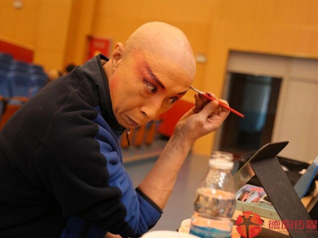 春节前后,演出不断,王松在排戏的间隙给自己上妆。德阳传媒记者 雷媛 摄