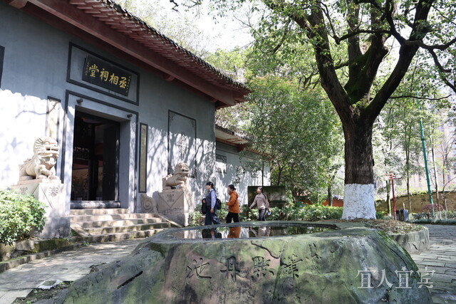 距离“曲水流觞”不远的丞相祠堂外,一棵樟树亭亭如盖,静立在戎州古八景之一的“笔点丹池”旁,迎来它的第141个春天。有游人借用杜甫的诗句“丞相祠堂何处寻?流杯池外翠樟生”形容古树与祠堂交相辉映的美景。
