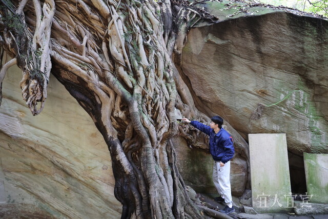 惊蛰时分,草木葳蕤,春风吹绿了长江首城。3月10日,宜宾流杯池公园(以下简称流杯池)“曲水流觞”处,年轻的古树管理人员袁岸正为石壁上一棵老根遒劲如盘龙的黄葛树清理枯叶和腐土。
