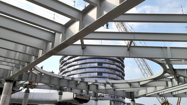 随后记者来到“慢行花园”的下方,从下往上看,主体结构仿佛一个大型的拼图七巧板,而这里正是低碳建造的秘密。“主体构件先在智能工厂完成预制,再运至现场拼装,同等建造量下,传统方式现场焊接往往需要4至5天,而现场拼装仅需半天即可完成。”项目技术负责人张豪表示,与传统浇筑混凝土相比,装配式钢结构施工既保障质量,又减少工地扬尘、能耗与碳排放,建设工期压缩4至6个月。