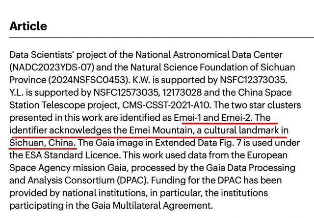 “峨眉”这个名字出来之后,各处评论区十分热闹。有人开玩笑“峨眉山文旅局赶紧打钱”,有人说“峨眉派这是要进军宇宙了”,还有人问“这俩星团是不是像峨眉山的两座山峰对峙”。