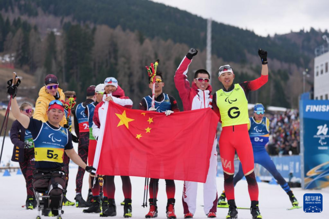 在意大利泰塞罗举行的米兰-科尔蒂纳冬残奥会越野滑雪公开接力4×2.5公里比赛中,中国队夺得冠军。中国队在赛后庆祝。(新华社记者 连振 摄)