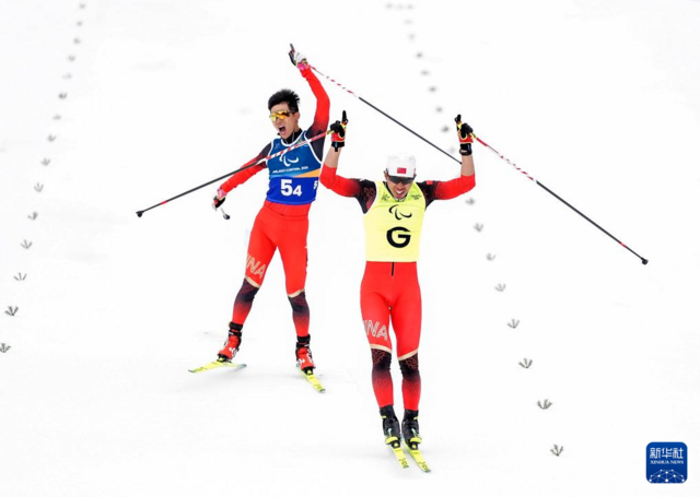 中国队选手余爽与引导员尚金财(前)在即将冲过终点时庆祝夺冠。(新华社记者 侯昭康 摄)