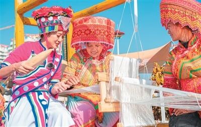 贺树美(中)与同伴一起展示傈僳族织布技艺。