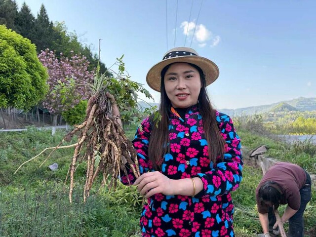 三月的巴中市恩阳区渔溪镇,漫山遍野的川明参迎来采挖季。清晨七点,天刚蒙蒙亮,渔溪镇电商服务中心主播刘阿梅就带着工具钻进了金山村的川明参种植基地。她蹲在田埂上,手里攥着一根刚挖出来的鲜参,仔细查看参条的粗细、色泽,时不时和身边的种植户交流:“你看这些参根须完整、通体黄亮,绝对能卖个好价钱。”
