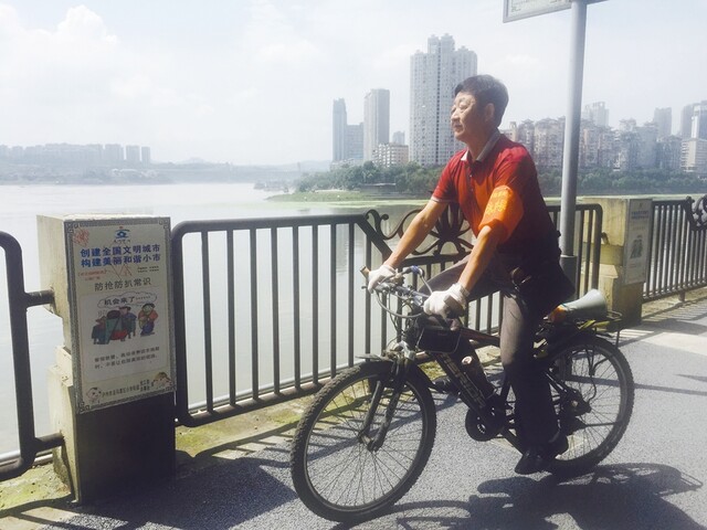 汪运全骑着自行车在社区巡逻。