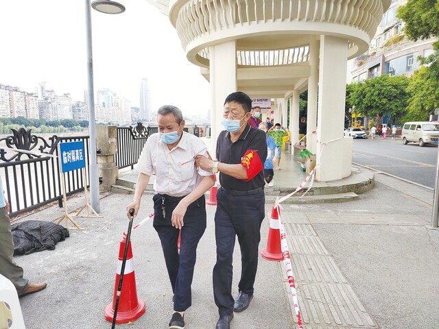 汪运全(右)帮助行动不便的老同志。