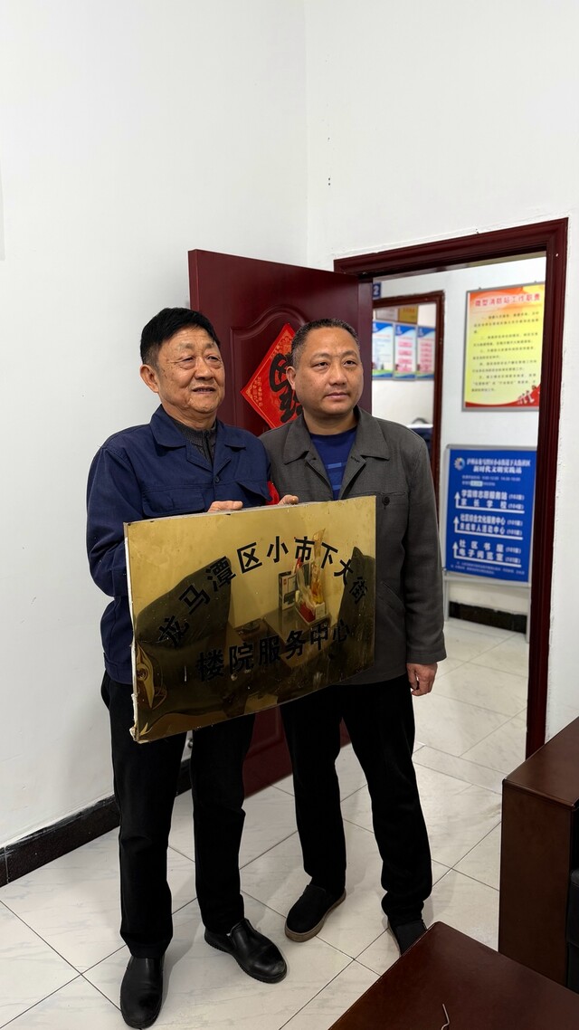 汪运全(左)向记者展示楼院服务中心的招牌。