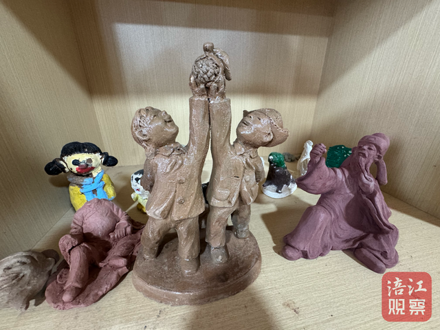 周勇拿起一件憨笑着的老夫妻泥塑向记者介绍:“这是我在村口遇见王大爷和王大妈讲悄悄话的场景。大爷手在空中比划得老高,王大妈就侧着耳朵,两位老人笑得皱纹都挤成了花,我当时就掏出随身带的泥,捏了他们这个模样。”