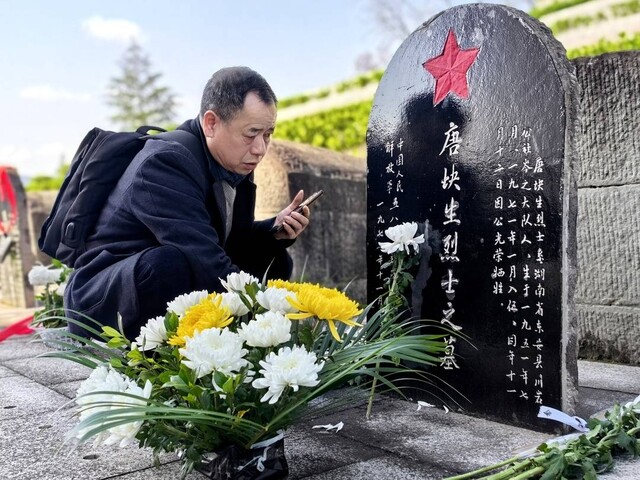 在达州红军烈士陵园工作人员的见证下,唐盛小心翼翼,把抱了一路的彩色照片放到墓碑前;唐满生、唐菊生兄弟俩站在一旁,向大哥说起家乡话,作揖的双手,禁不住颤抖。