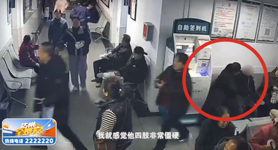 患者女儿 唐女士:候诊的过程中突然我爸爸的手,就放在我腿上了,我就感觉他四肢非常僵硬,人也喊不答应,又发现他口吐白沫,直接就昏倒在那里,意识不清楚了,当时很紧急,很突然。