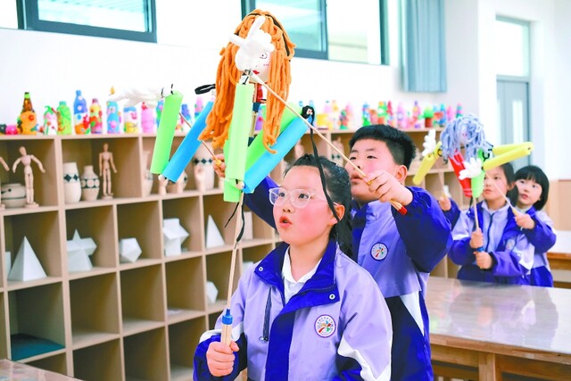 于是,语文课上讲述木偶故事;美术课上画偶、做偶;“木偶社”的孩子们练走位、学操作;非遗传承人每周到校手把手指导……如今,孩子们已能自制简易木偶并操作。
