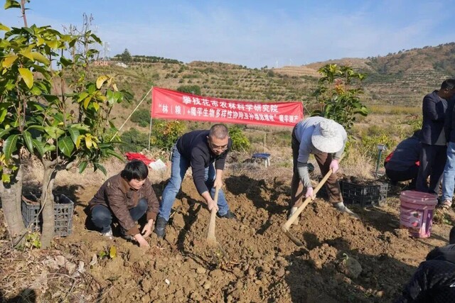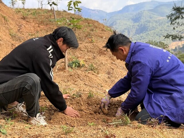 4月8日,攀枝花市仁和区啊喇彝族乡起查喇村,明燕家庭农场190余亩樱桃、核桃、桃子林下,父子俩正带领村民种下魔芋。