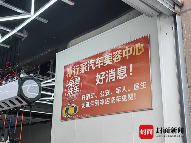 2024年,他在东兴区开了这家洗车店,开业当天便贴出了免费洗车告示,消防、公安、军人、医生凭证件到本店洗车免费,每辆车仅限1月1次。