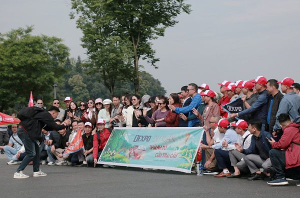 来自越南的旅行团在乐山大佛景区合影留念(记者 宋雪 摄)