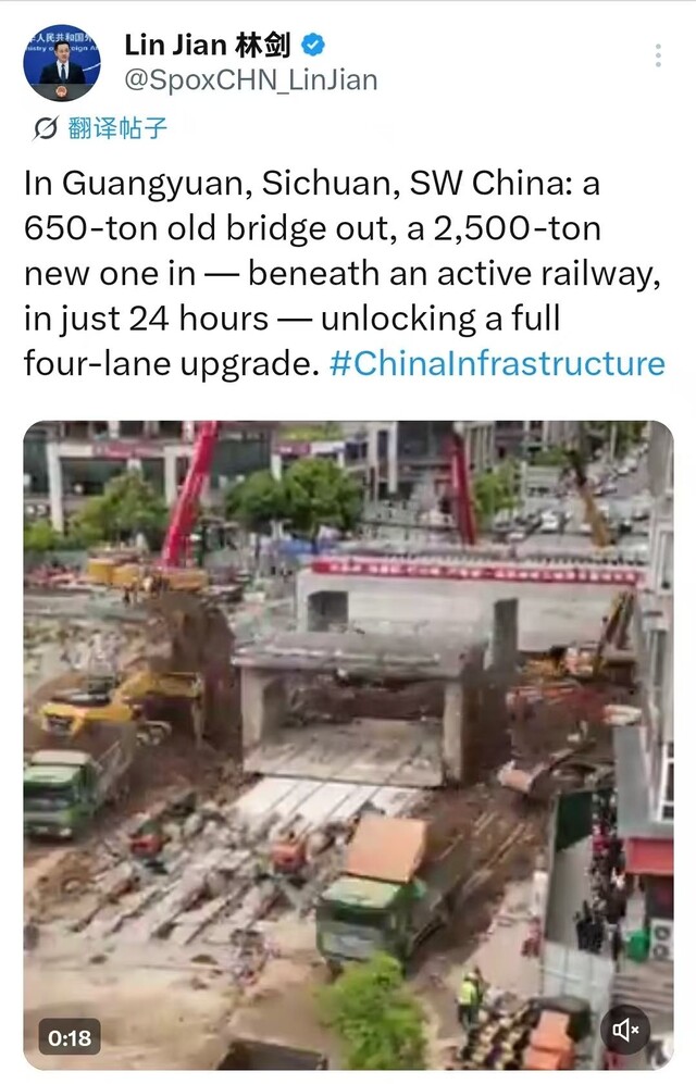 4月19日,外交部发言人林剑在其社交软件上专门点赞广元,历经24小时连续“大天窗”封锁作业,2500吨预制框架桥顺利下穿广达铁路。该项目和推文受到了国内外网友广泛关注和好评,让人直观感受到中国基建的魅力。这也是继华春莹、毛宁多次点赞广元后,外交部发言人又一次推荐广元。