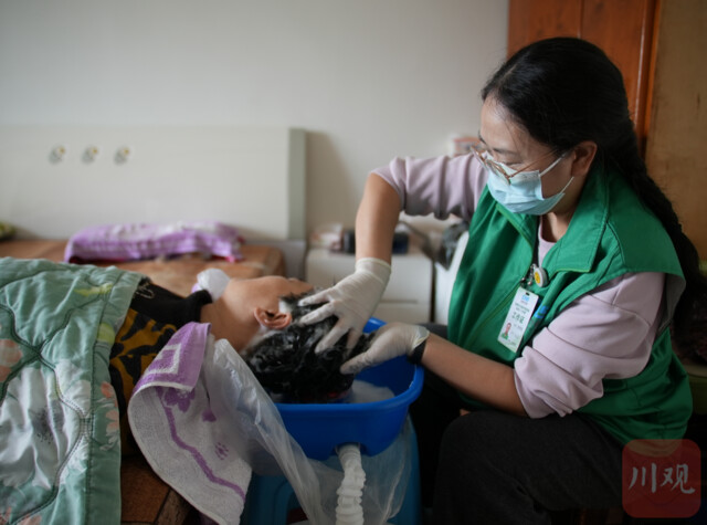 张雪莲为失能患者洗头。韦维 摄影
