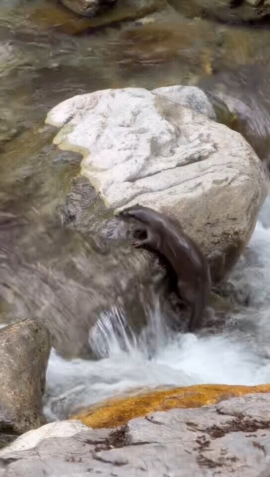 通过视频显示,只见这只欧亚水獭时而潜入清澈见底的河中进行自由式游泳;时而爬上河中礁石顽皮地撒欢打滚,玩得不亦乐乎。