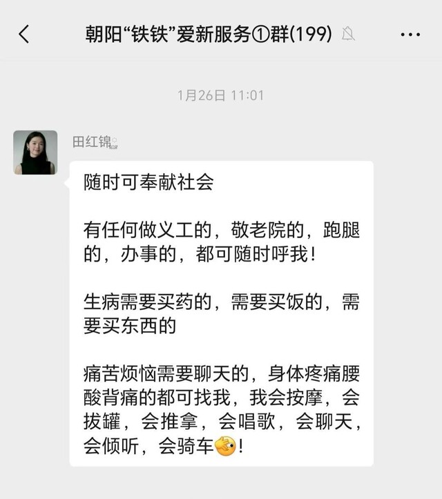 很久以前,她就在朝阳“铁铁”爱新服务群里发过一段话:随时可奉献社会。有任何做义工的,去敬老院的,跑腿的,办事的,都可随时呼我!生病需要买药的、买饭的、买东西的,痛苦烦恼需要聊天的,身体疼痛腰酸背痛的都可找我,我会按摩、拔罐、推拿,可以唱歌、聊天、倾听,还会骑车。