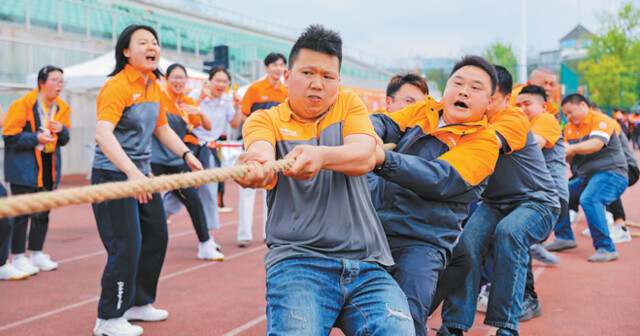 成都“小哥”运动会现场,参赛选手在拔河比赛中。